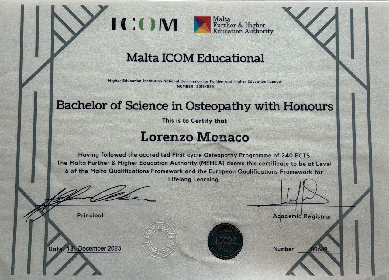 Mi chiamo Lorenzo Monaco e sono un osteopata formato presso l’International College of Osteopathic Medicine (ICOM) di Firenze.
